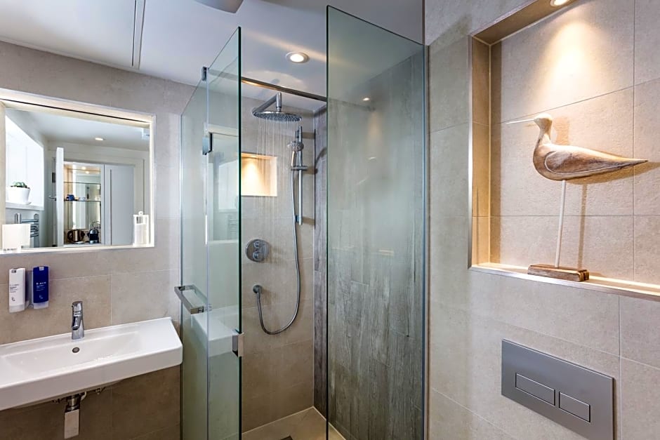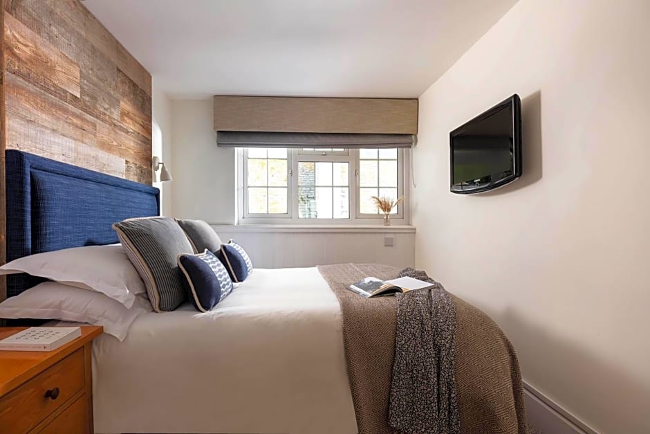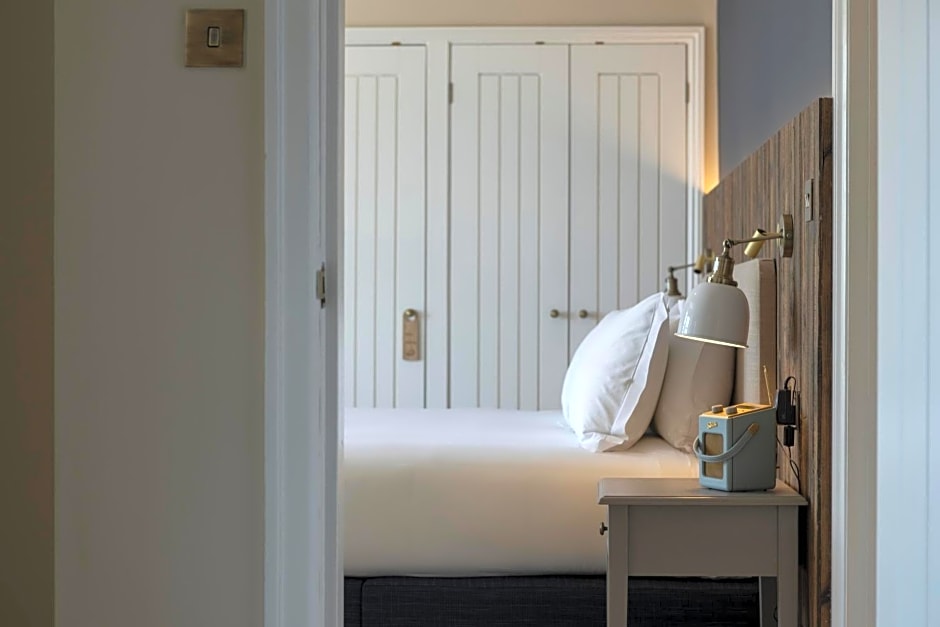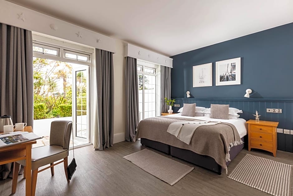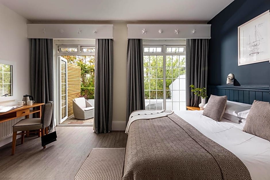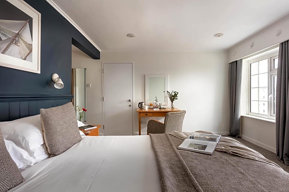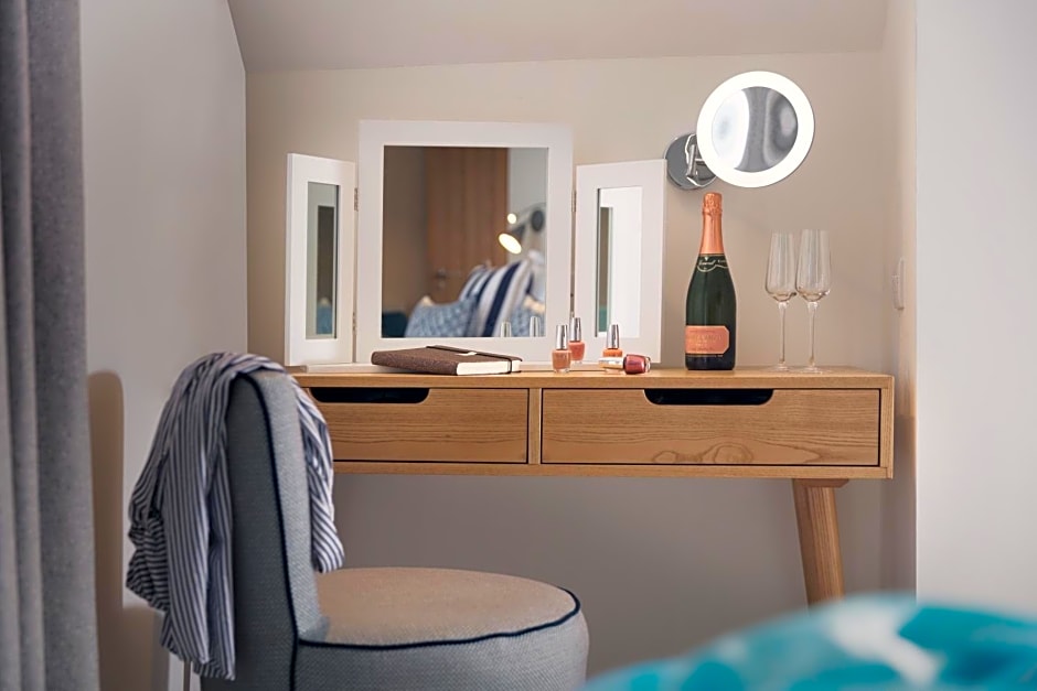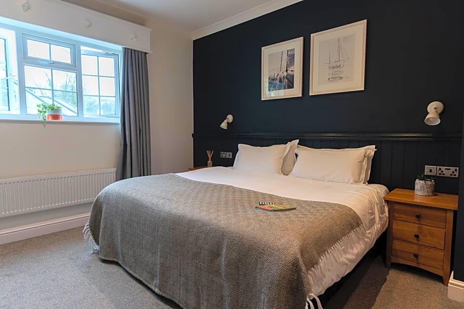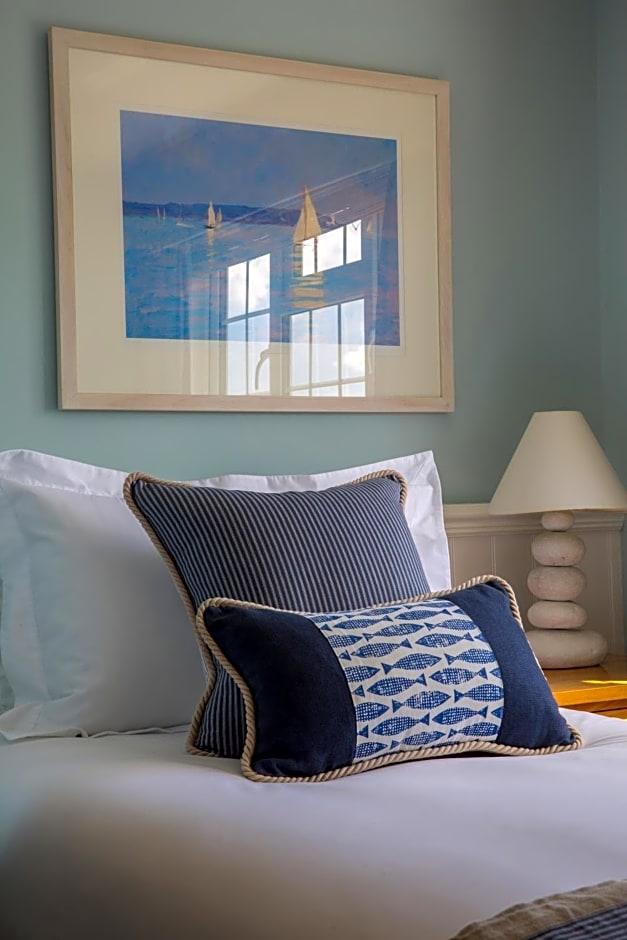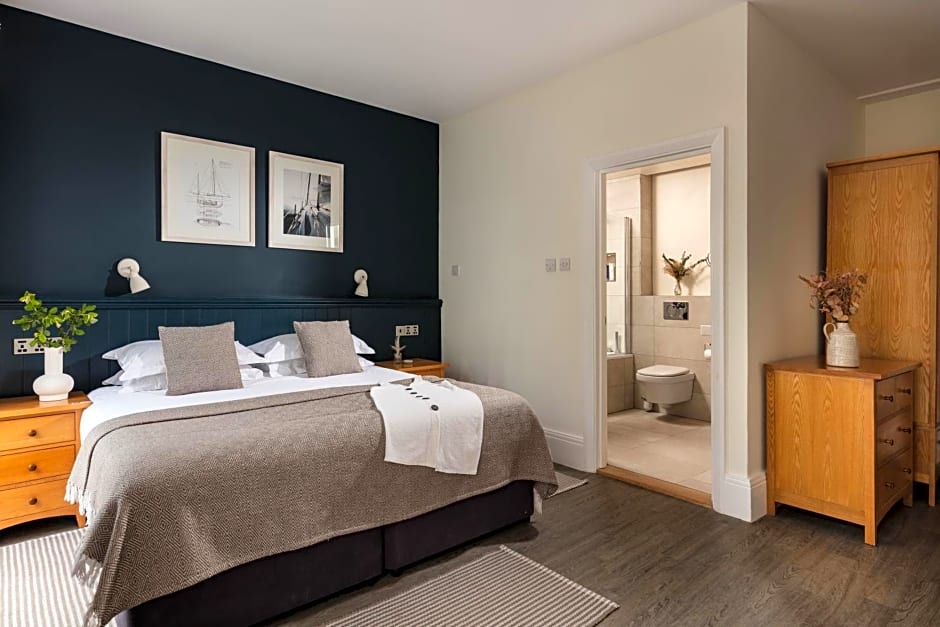 Stylish bedroom with nautical décor, featuring a flat-screen TV and free Wi-Fi access, as well as tea/coffee facilities and quality toiletries.