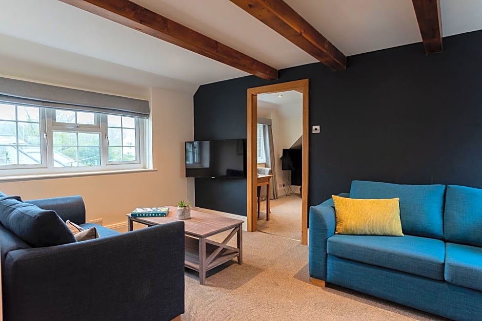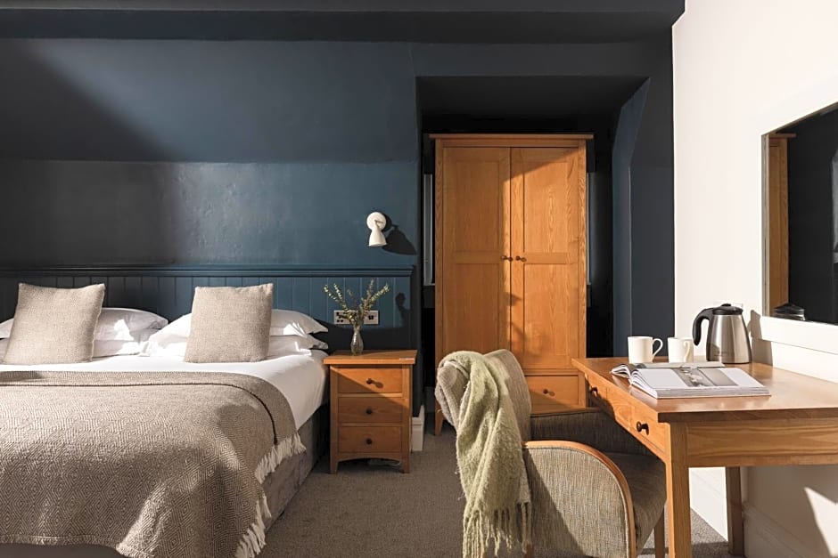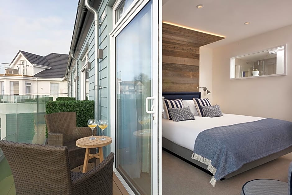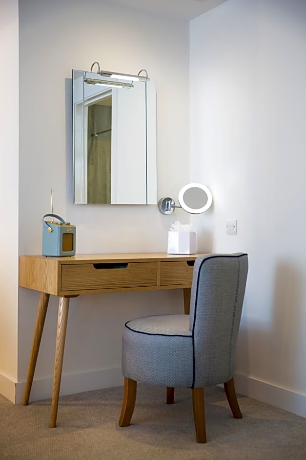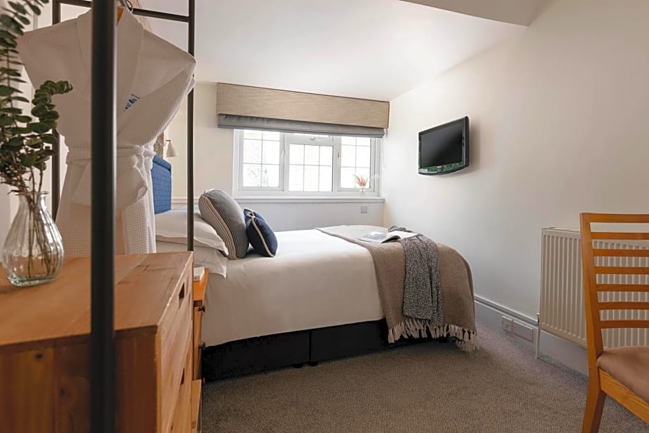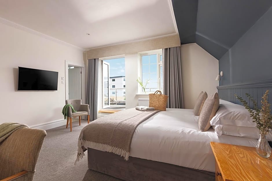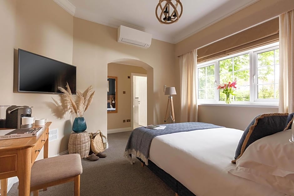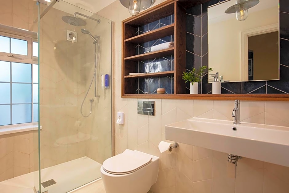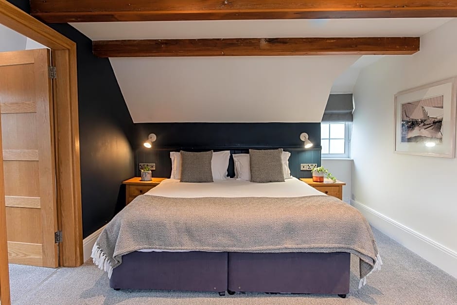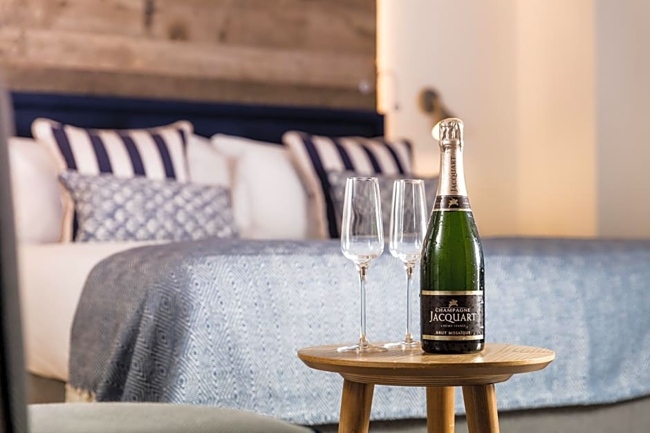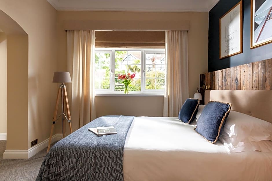 Stylish bedroom with nautical décor, featuring a flat-screen TV and free Wi-Fi access, as well as tea/coffee facilities and quality toiletries.