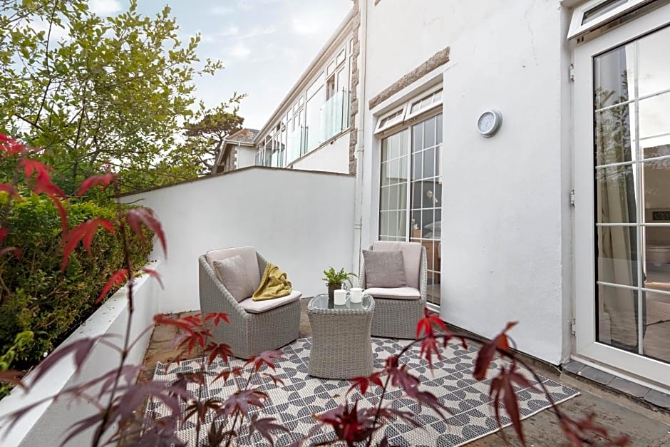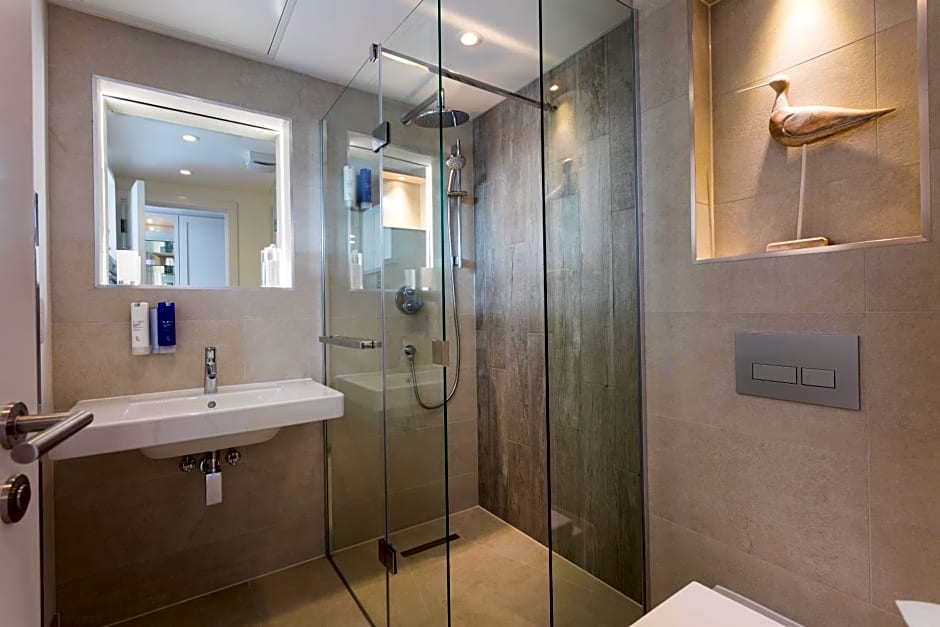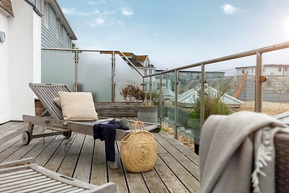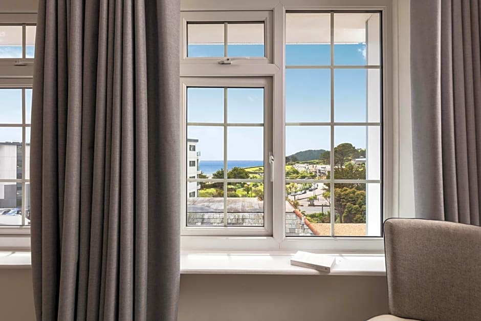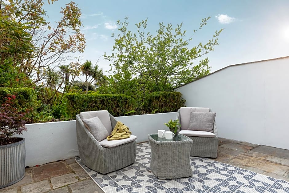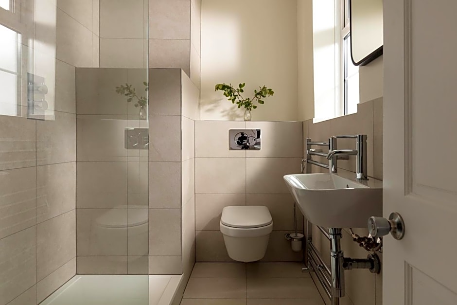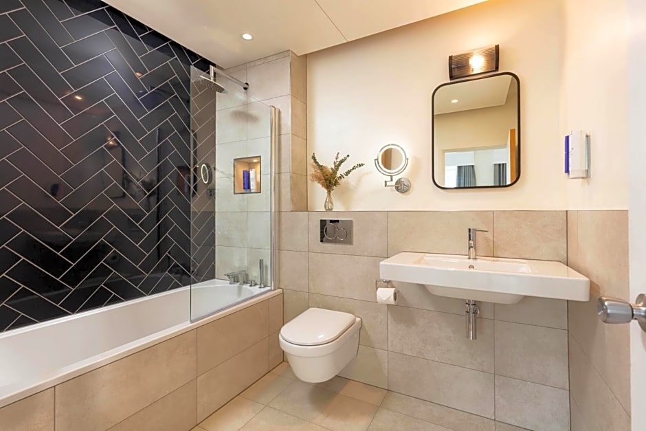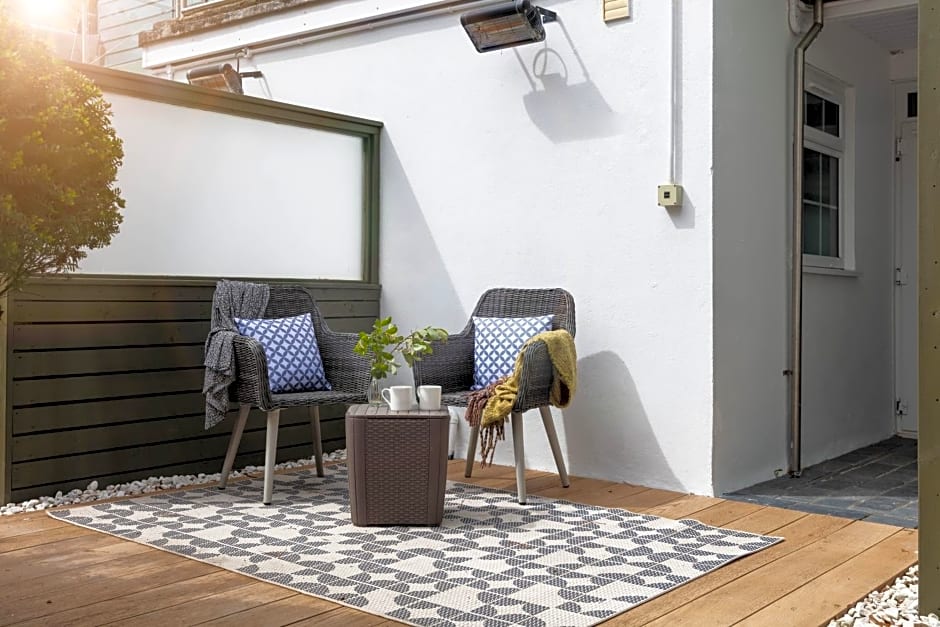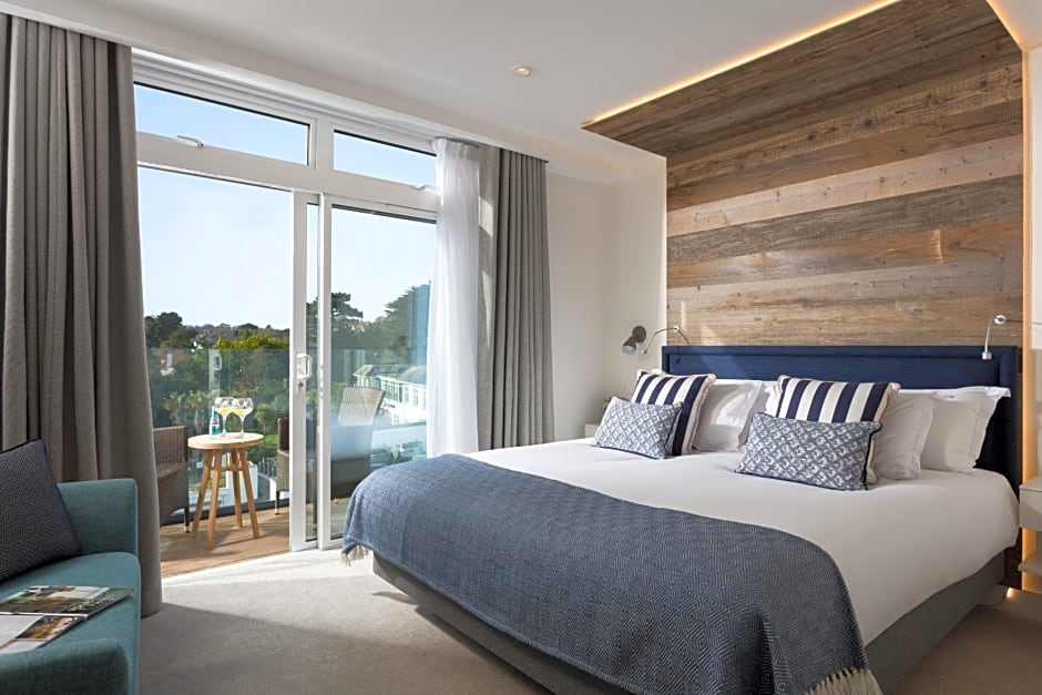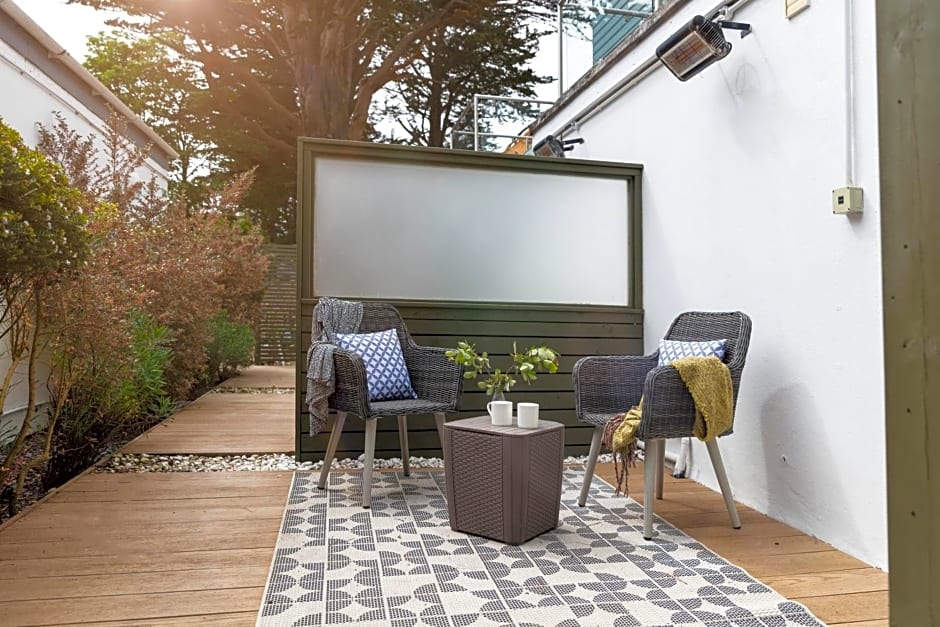 Stylish bedroom with nautical décor, featuring a flat-screen TV and free Wi-Fi access, as well as tea/coffee facilities and quality toiletries.
